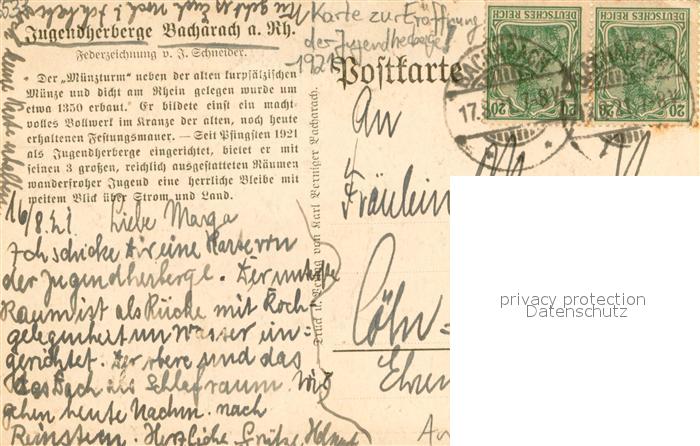73754269 alte Postkarte Bacharach Rhein Jugendherberge postalisch gelaufen Erhaltung siehe scans [LiesaD40] KatCode: 11110007339003