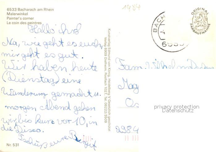 72925543 alte Postkarte Bacharach Rhein Malerwinkel postalisch gelaufen Erhaltung siehe scans [NatalD47] KatCode: 11110007339003