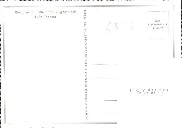 41601106 Bacharach Rhein mit Burg Stahleck Insel Fliegeraufnahme Kupfertiefdruck KatCode 11110007339003