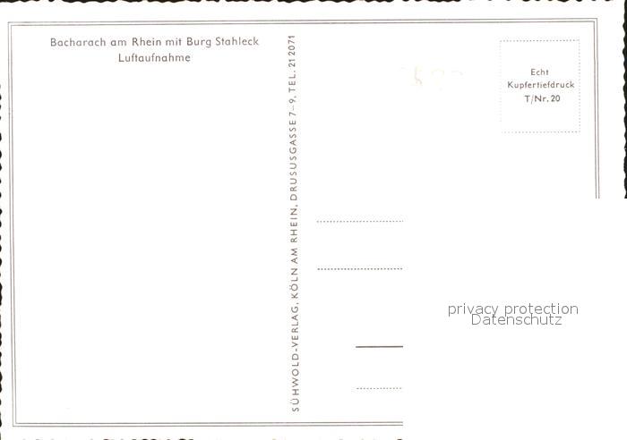 41601107 Bacharach Rhein mit Burg Stahleck Insel Fliegeraufnahme Kupfertiefdruck KatCode 11110007339003