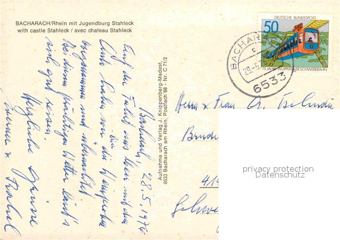 72737589 alte Postkarte Bacharach Rhein Panorama mit Jugendburg Stahleck postalisch gelaufen Erhaltung siehe scans [FriedD77] KatCode: 11110007339003
