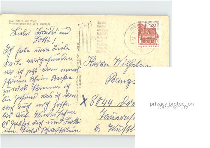 72362142 alte Postkarte Bacharach Rhein Rheinanlagen mit Burg Stahleck postalisch gelaufen Erhaltung siehe scans KatCode: 11110007339003