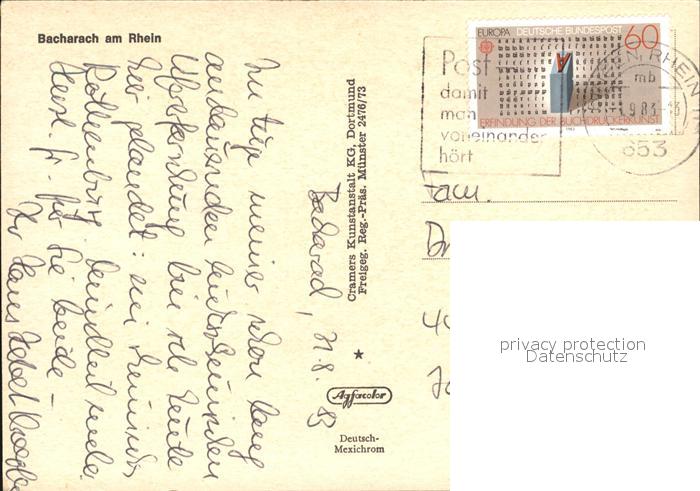 72419615 alte Postkarte Bacharach Rhein Rheininsel Fliegeraufnahme postalisch gelaufen Erhaltung siehe scans KatCode: 11110007339003