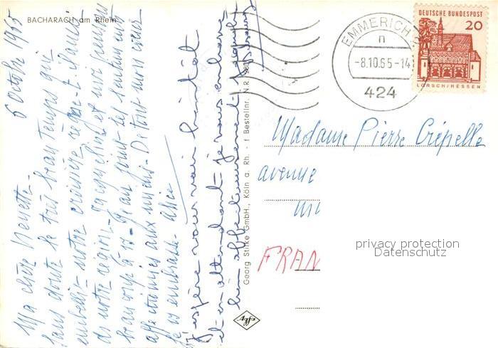 73335507 alte Postkarte Bacharach Rhein Stadtpanorama mit Blick ueber den Rhein Weinberge postalisch gelaufen Erhaltung siehe scans [FriedD77] KatCode: 11110007339003