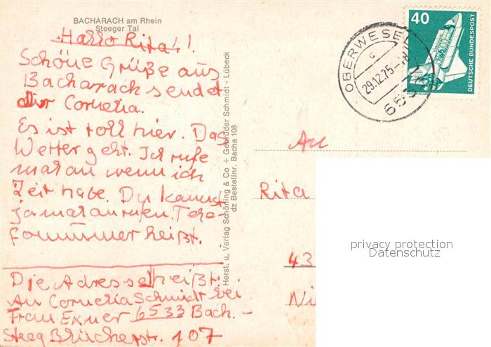 73012263 alte Postkarte Bacharach Rhein Steeger Tal postalisch gelaufen Erhaltung siehe scans [KathaD81] KatCode: 11110007339003