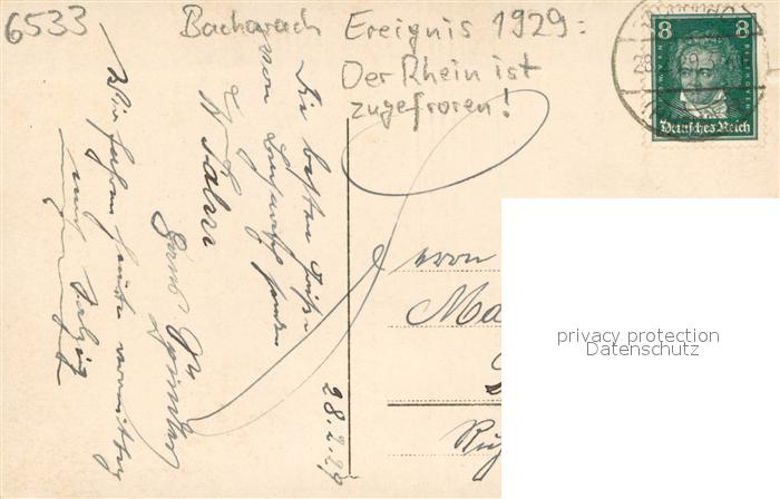 33700616 alte Postkarte Bacharach Rhein Zugefrorener Rhein 1929 postalisch gelaufen Erhaltung siehe scans [WerneD78] KatCode: 11110007339003