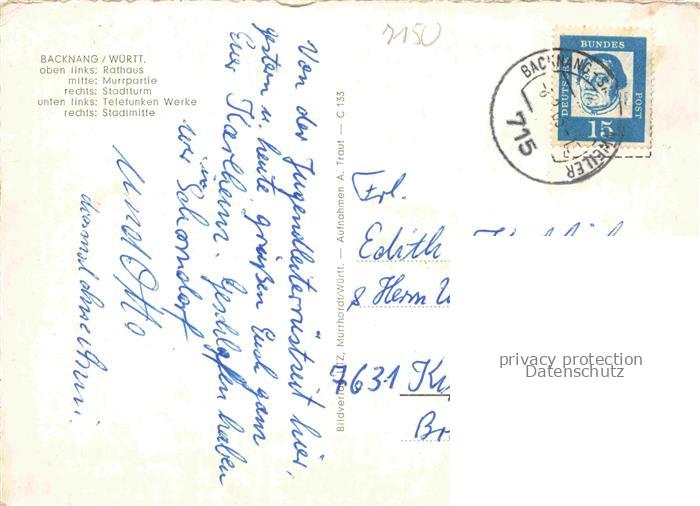 74053162 alte Postkarte Backnang BW Rathaus Murrpartie Stadtturm Telefunkenwerke Stadtmitte postalisch gelaufen Erhaltung siehe scans [WerneD78] KatCode: 11110008119008