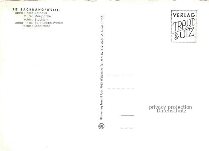 74052716 Backnang BW Rathaus Murrpartie Stadtturm Telefunkenwerke Stadtmitte postalisch nicht gelaufen Erhaltung siehe scans [WerneD78] KatCode: 11110008119008