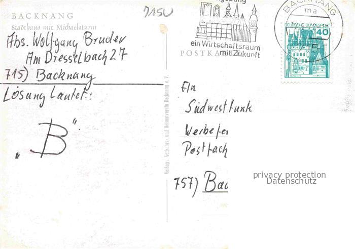 74052724 alte Postkarte Backnang BW Stadthaus mit Michaelsturm postalisch gelaufen Erhaltung siehe scans [WerneD78] KatCode: 11110008119008