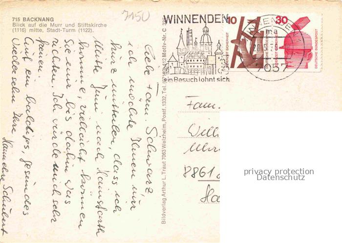 74053056 alte Postkarte Backnang BW Stiftskirche mit Stadtturm postalisch gelaufen Erhaltung siehe scans [WerneD78] KatCode: 11110008119008