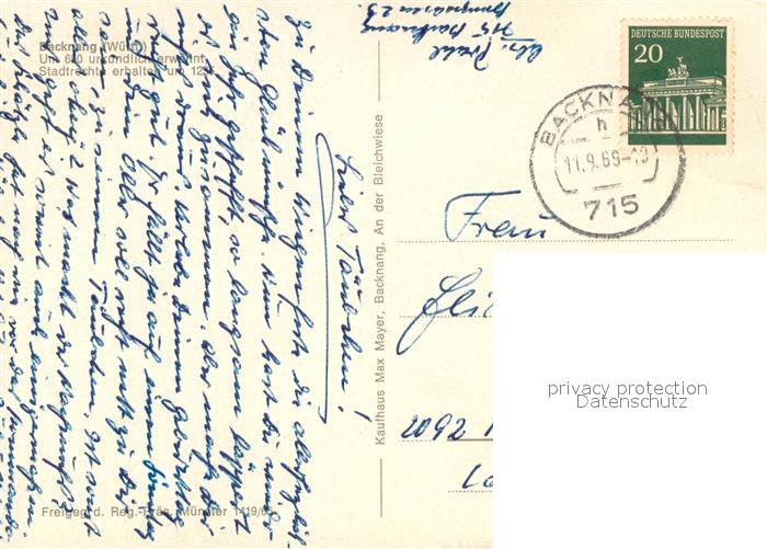 73686167 alte Postkarte Backnang Fliegeraufnahme postalisch gelaufen Erhaltung siehe scans [WerneD78] KatCode: 11110008119008