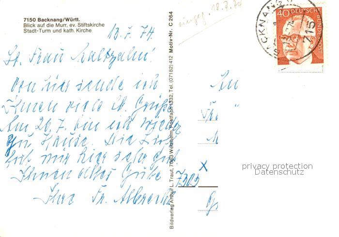 72628541 alte Postkarte Backnang Murrpartie Ev Stiftskirche Stadtturm und kath Kirche postalisch gelaufen Erhaltung siehe scans [WerneD78] KatCode: 11110008119008