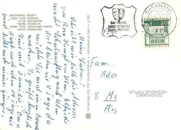 73835545 alte Postkarte Backnang Rathaus Murrpartie Stadtturm Telefunken Werke Stadtmitte postalisch gelaufen Erhaltung siehe scans [WerneD78] KatCode: 11110008119008