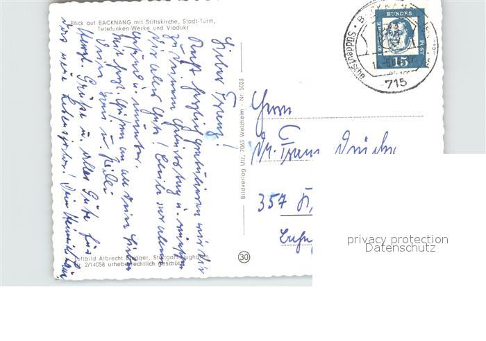 32572037 alte Postkarte Backnang Stiftskirche Stadt Turm Telefunkenwerke Viadukt Fliegeraufnahme postalisch gelaufen Erhaltung siehe scans [WerneD78] KatCode: 11110008119008