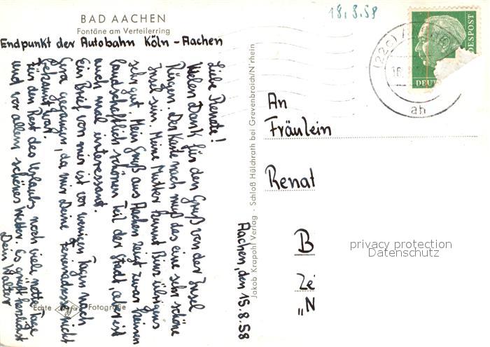 73574094 alte Postkarte Bad Aachen Fontaene am Verteilerring postalisch gelaufen Erhaltung siehe scans [FriedD77] KatCode: 11110005313000