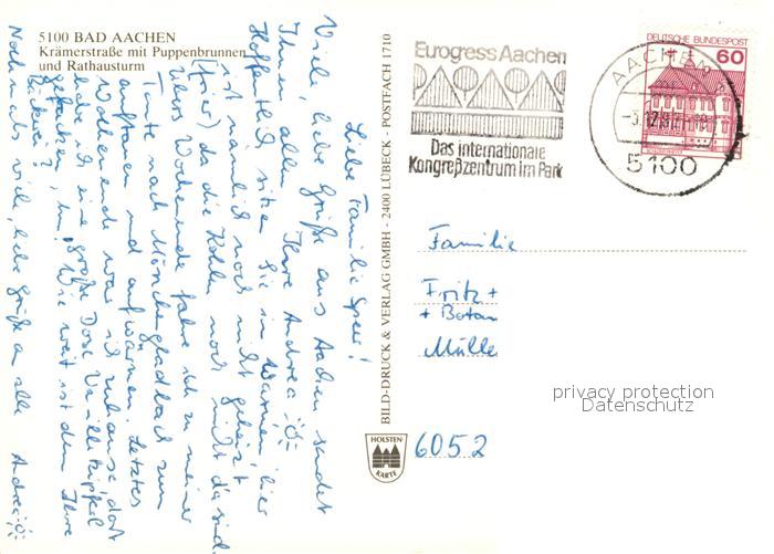 73240523 alte Postkarte Bad Aachen Kraemerstrasse Puppenbrunnen Rathausturm postalisch gelaufen Erhaltung siehe scans [KathaD81] KatCode: 11110005313000
