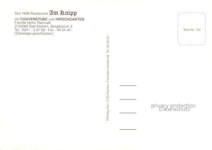73845559 Bad Aachen Restaurant Am Knipp mit Couvenstube und Hirschgarten postalisch nicht gelaufen Erhaltung siehe scans [WerneD78] KatCode: 11110005313000