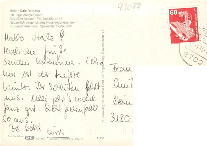 73884524 alte Postkarte Bad Abbach Hotel Cafe Rathaus Terrasse Gastraeume Park postalisch gelaufen Erhaltung siehe scans [WerneD78] KatCode: 11110009273116