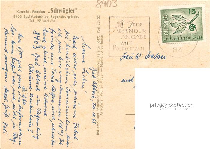 73870803 alte Postkarte Bad Abbach Kurcafe Pension Schwoegler postalisch gelaufen Erhaltung siehe scans [WerneD78] KatCode: 11110009273116