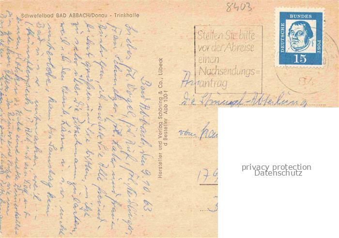 74049108 alte Postkarte Bad Abbach Schwefelbad Trinkhalle postalisch gelaufen Erhaltung siehe scans [FriedD77] KatCode: 11110009273116