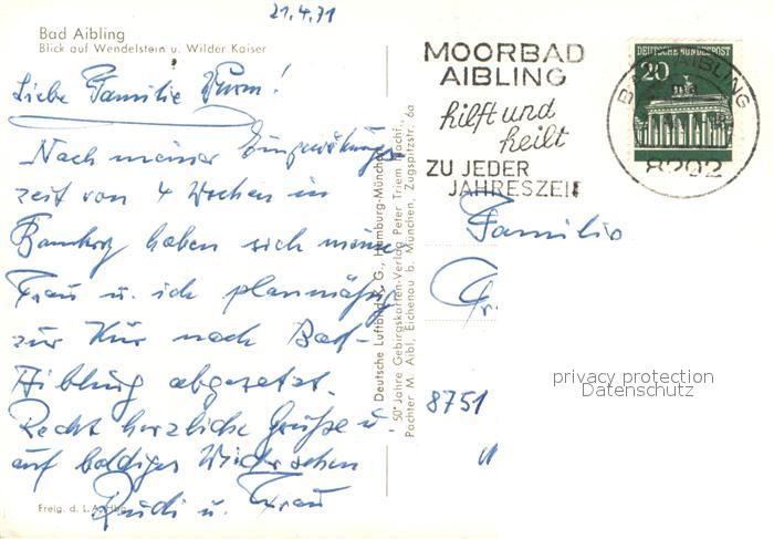 73689568 alte Postkarte Bad Aibling Fliegeraufnahme mit Wendelstein und Wilder Kaiser postalisch gelaufen Erhaltung siehe scans [WerneD78] KatCode: 11110009187117