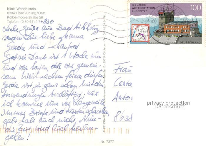 73175742 alte Postkarte Bad Aibling Klinik Wendelstein Breitenstein Sonnenwendjoch postalisch gelaufen Erhaltung siehe scans [NatalD47] KatCode: 11110009187117