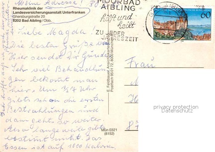 73060135 alte Postkarte Bad Aibling Rheumaklinik der LVA Unterfranken Gastraum Kirche Hallenbad postalisch gelaufen Erhaltung siehe scans [FriedD77] KatCode: 11110009187117