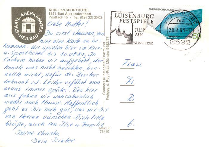 73949427 alte Postkarte Bad Alexandersbad Fliegeraufnahme mit Kur und Sporthotel postalisch gelaufen Erhaltung siehe scans [WerneD78] KatCode: 11110009479111