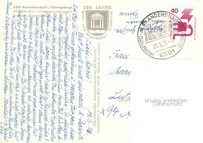 72654463 alte Postkarte Bad Alexandersbad Panorama Altes Schloss mit Kuranlage Luisenquelle Kurhaus Musikpavillon postalisch gelaufen Erhaltung siehe scans [WerneD78] KatCode: 11110009479111