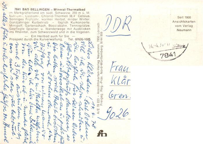73878381 alte Postkarte Bad Bellingen Fliegeraufnahme postalisch gelaufen Erhaltung siehe scans [WerneD78] KatCode: 11110008336006