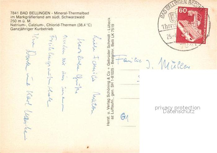 73271807 alte Postkarte Bad Bellingen Fliegeraufnahme mit Mineral Thermalbad postalisch gelaufen Erhaltung siehe scans [WerneD78] KatCode: 11110008336006