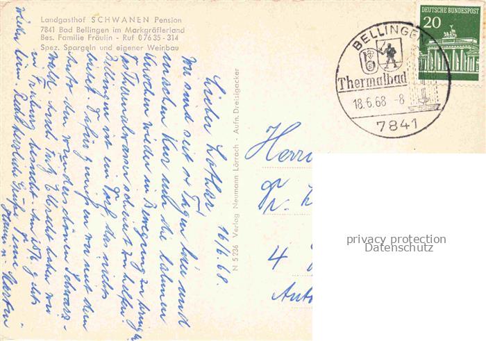 74097852 alte Postkarte Bad Bellingen Landgasthof Schwanen Pension postalisch gelaufen Erhaltung siehe scans [WerneD78] KatCode: 11110008336006