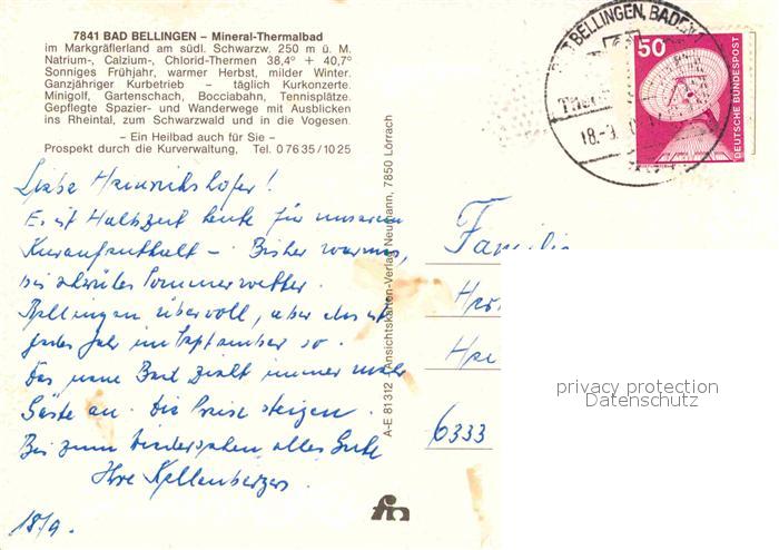 72897325 alte Postkarte Bad Bellingen Mineral Thermalbad Fontaene Hallenbad Minigolf postalisch gelaufen Erhaltung siehe scans [WerneD78] KatCode: 11110008336006