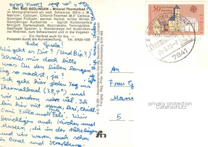 72781974 alte Postkarte Bad Bellingen Mineral Thermalbad im Schwarzwald Fliegeraufnahme postalisch gelaufen Erhaltung siehe scans [FriedD77] KatCode: 11110008336006
