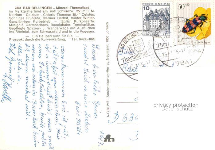 72629423 alte Postkarte Bad Bellingen Mineral Thermalbad Kurhaus Fontaene Park Minigolf Freibad postalisch gelaufen Erhaltung siehe scans [WerneD78] KatCode: 11110008336006