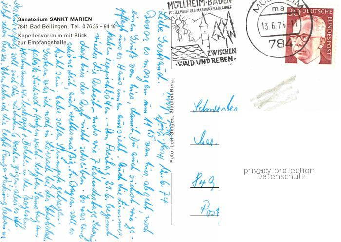 72760588 alte Postkarte Bad Bellingen Sanatorium Sankt Marien postalisch gelaufen Erhaltung siehe scans [LiesaD40] KatCode: 11110008336006