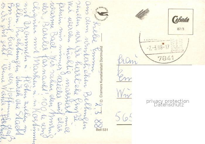 73214742 alte Postkarte Bad Bellingen St Leodegar Kirche Rathaus Kurpark Freibad Hallenbad Kurhaus Chronik postalisch gelaufen Erhaltung siehe scans [FriedD77] KatCode: 11110008336006