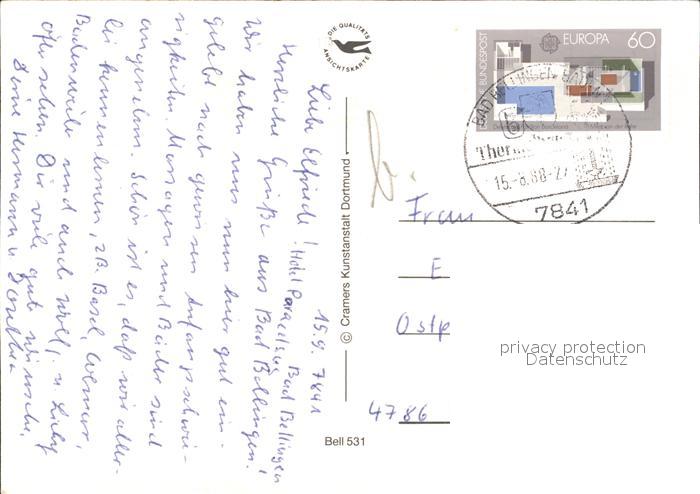 72279944 alte Postkarte Bad Bellingen St Leodegar Kirche Rathaus Kurpark Thermalbad Kurhaus Geschichte postalisch gelaufen Erhaltung siehe scans KatCode: 11110008336006