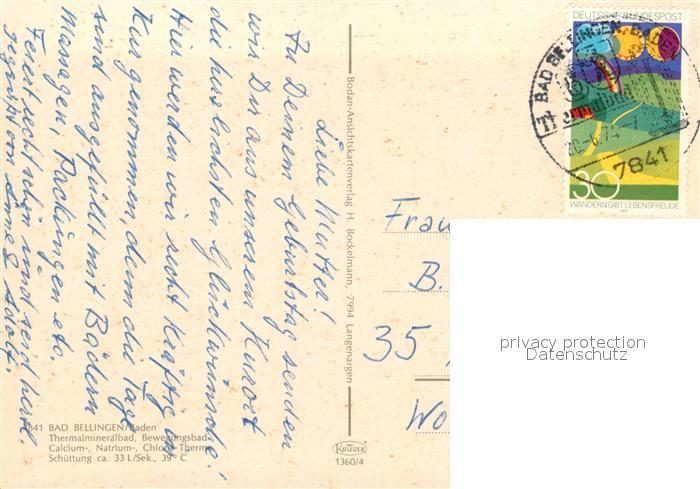 73154267 alte Postkarte Bad Bellingen Thermalbad postalisch gelaufen Erhaltung siehe scans [LiesaD40] KatCode: 11110008336006
