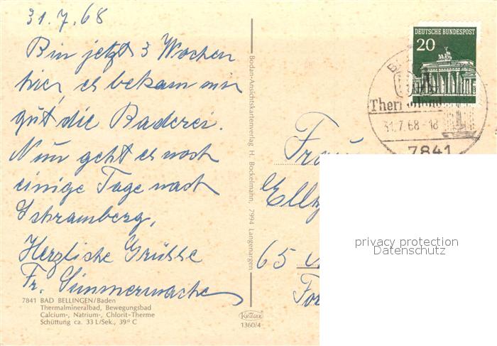73176442 alte Postkarte Bad Bellingen Thermalbad Stadtpanorama Schlossplatz Trinkbrunnen postalisch gelaufen Erhaltung siehe scans [FriedD77] KatCode: 11110008336006
