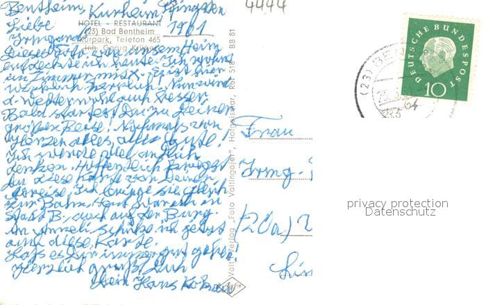 73699247 alte Postkarte Bad Bentheim Hotel Restaurant am Kurpark postalisch gelaufen Erhaltung siehe scans [FriedD77] KatCode: 11110003456001