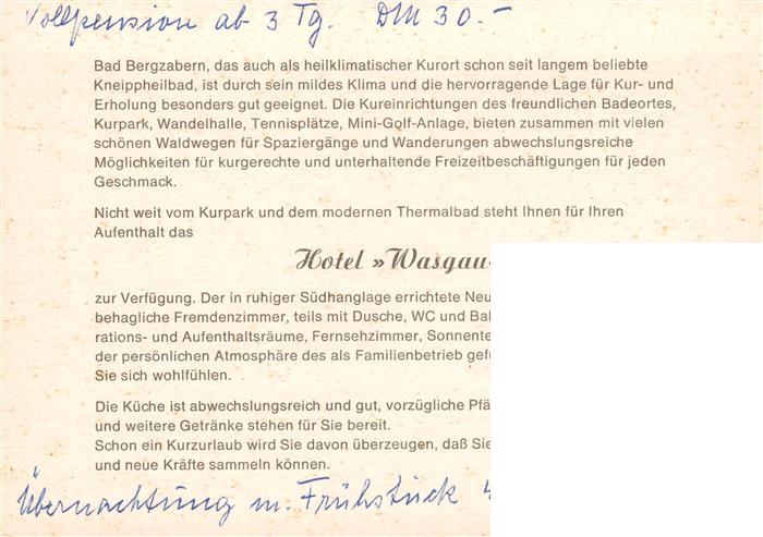 73875056 Bad Bergzabern Hotel Wasgau Restaurant Fremdenzimmer Landschaftspanorama postalisch nicht gelaufen Werbekarte (keine Postkarte) Erhaltung siehe scans [FriedD77] KatCode: 11110007337005