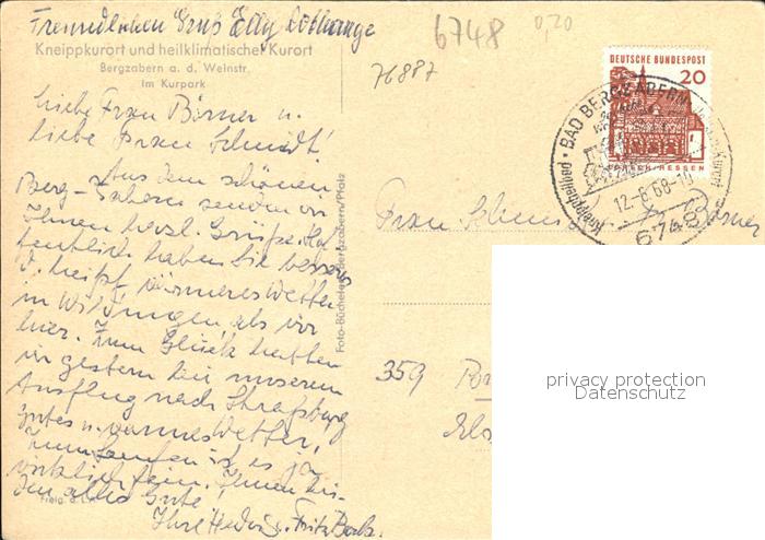 72515587 alte Postkarte Bad Bergzabern Im Kurpark postalisch gelaufen Erhaltung siehe scans KatCode: 11110007337005