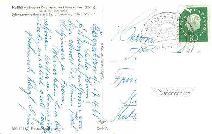 72892462 alte Postkarte Bad Bergzabern Schwanenweiher Erholungsheim Pfaelzer Wald postalisch gelaufen Erhaltung siehe scans [PaolaD17] KatCode: 11110007337005