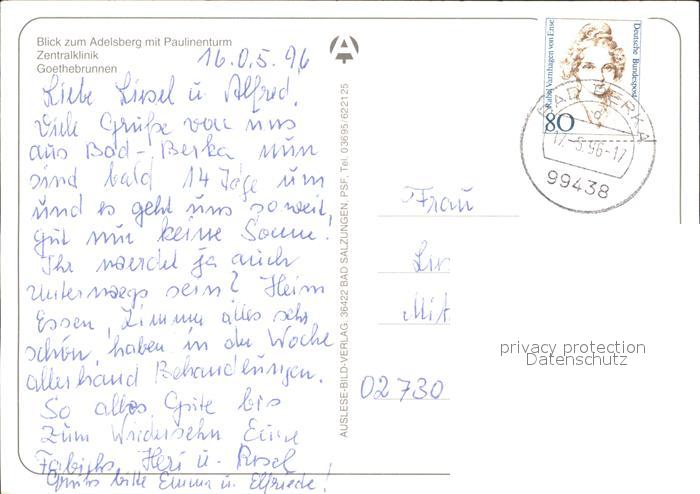72337064 alte Postkarte Bad Berka Blick zum Adelsberg Paulinenturm Zentralklinik Goethebrunnen postalisch gelaufen Erhaltung siehe scans KatCode: 11110016071003