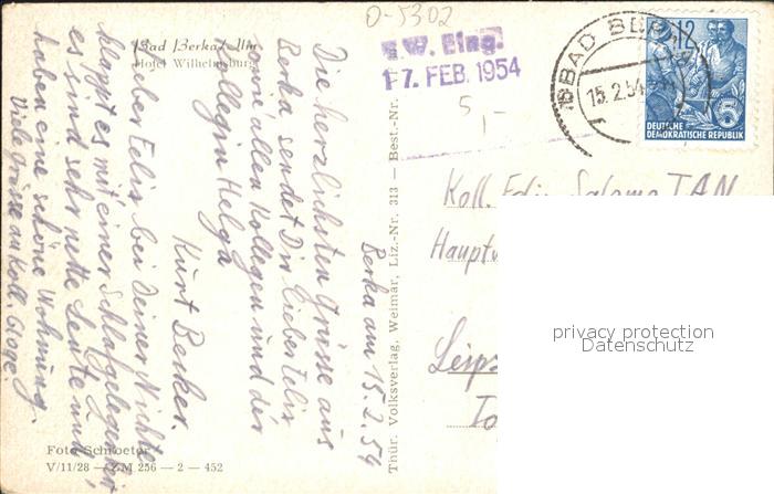 72057464 alte Postkarte Bad Berka Hotel Wilhelmsburg postalisch gelaufen Erhaltung siehe scans KatCode: 11110016071003