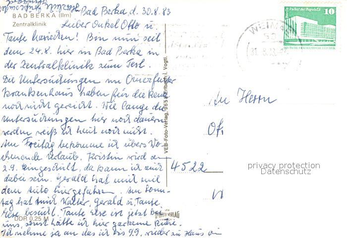 72925747 alte Postkarte Bad Berka Zentralklinik postalisch gelaufen Erhaltung siehe scans [PaolaD17] KatCode: 11110016071003