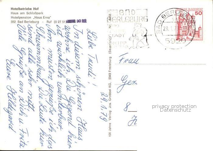 71894122 alte Postkarte Bad Berleburg Hotelpension Haus Erna Haus am Schlosspark postalisch gelaufen Erhaltung siehe scans KatCode: 11110005970004