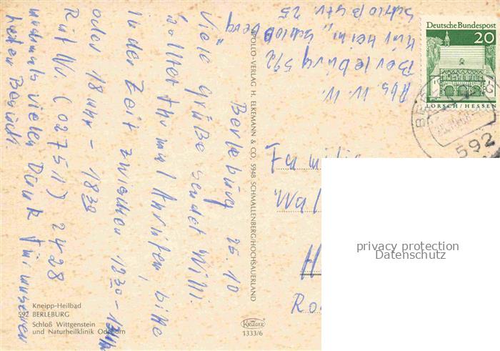 Bad Berleburg NRW Schloss Wittgenstein und Naturheilklinik Odeborn postalisch gelaufen Erhaltung siehe scans [WerneD78] alte Postkarte Wern Katcode 11110005970004
