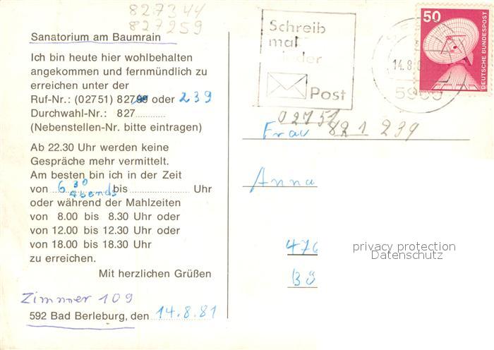 73687037 alte Postkarte Bad Berleburg Sanatorium am Baumrain postalisch gelaufen Erhaltung siehe scans [WerneD78] KatCode: 11110005970004